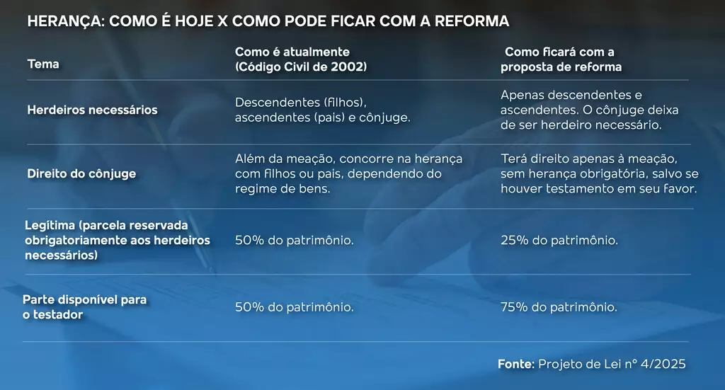 As propostas de reforma do Código Civil trazem mudanças que impactam diretamente a forma como a herança será distribuída após a morte. Entre as principais alterações, estão a exclusão do cônjuge da lista de herdeiros necessários e a destinação de tudo para os filhos.