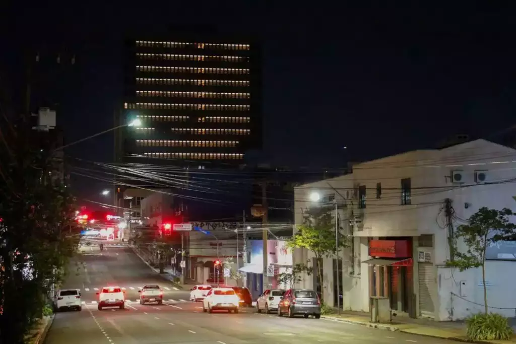 Luzes acesas do Hotel Campo Grande iluminam o Centro (Foto: Direto das Ruas)