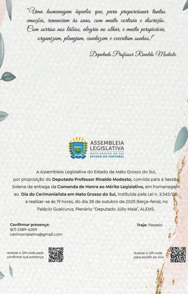 O DEPUTADO PROFESSOR RINALDO MODESTO, CONVIDA A TODOS PARA SESSÃO SOLENE DE ENTREGA DA COMENDA DE HONRA AO MÉRITO LEGISLATIVO Por: Noticias Digital – 28/10/2025 – fonte: Assessoria de Comunicação